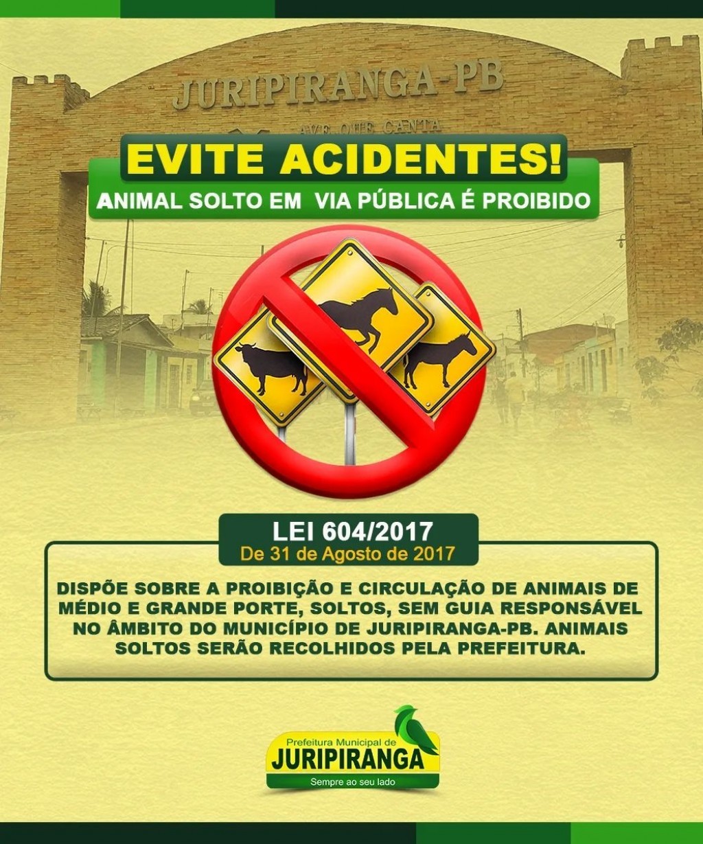 A Prefeitura Municipal de Juripiranga comunica que, através da Lei nº 604/2017, fica proibido a circulação e permanência de animais de médio e grande porte soltos, sem guia, no âmbito do município de Juripiranga, incluindo as Rodovias Estaduais nas delimitações do município.